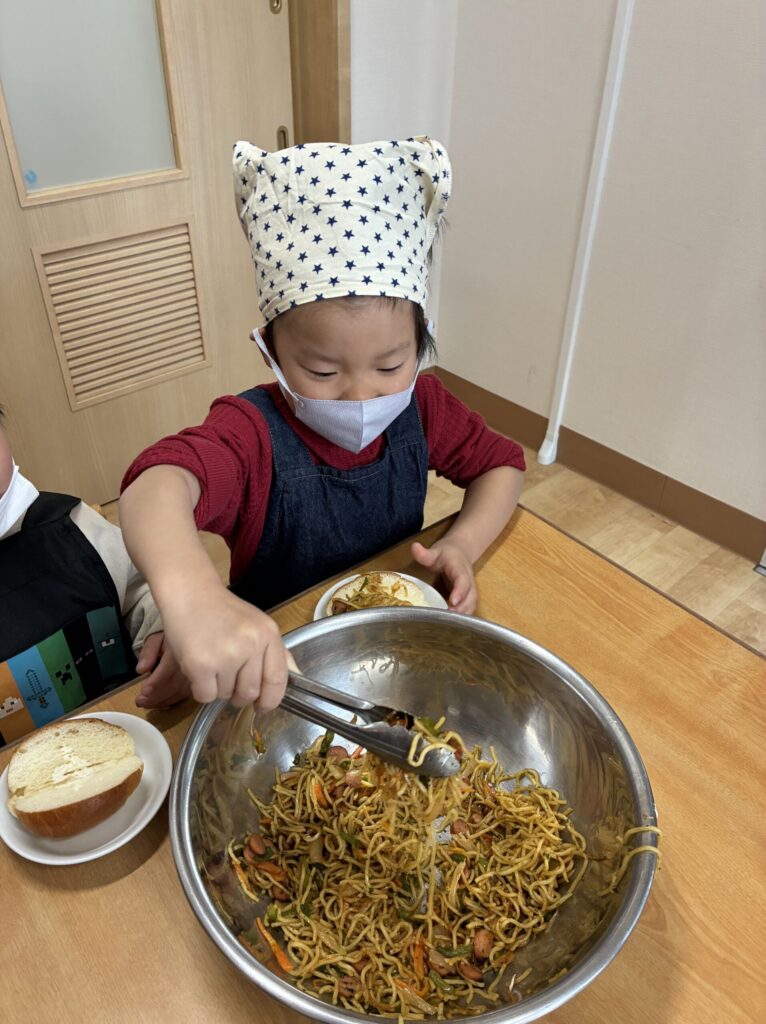 年中さんのクッキングでは、焼きそばパン作りを行いました。
