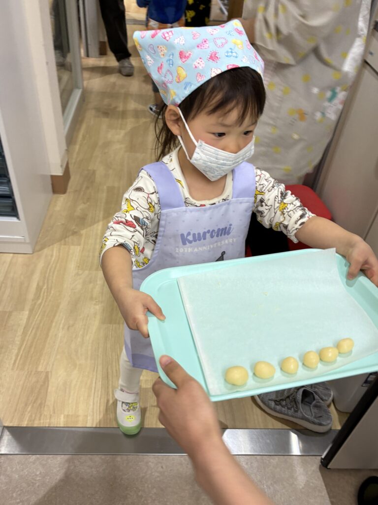 クッキー生地を丸めて、給食室まで運び、焼いてもらいました。